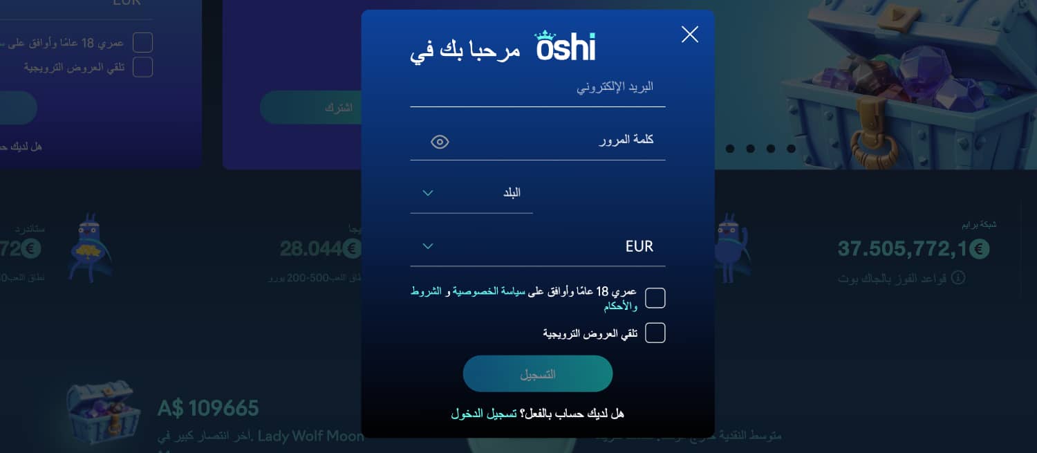 عملية التسجيل في كازينو Oshi بسيطة وسريعة. إليكم الخطوات الأساسية:
