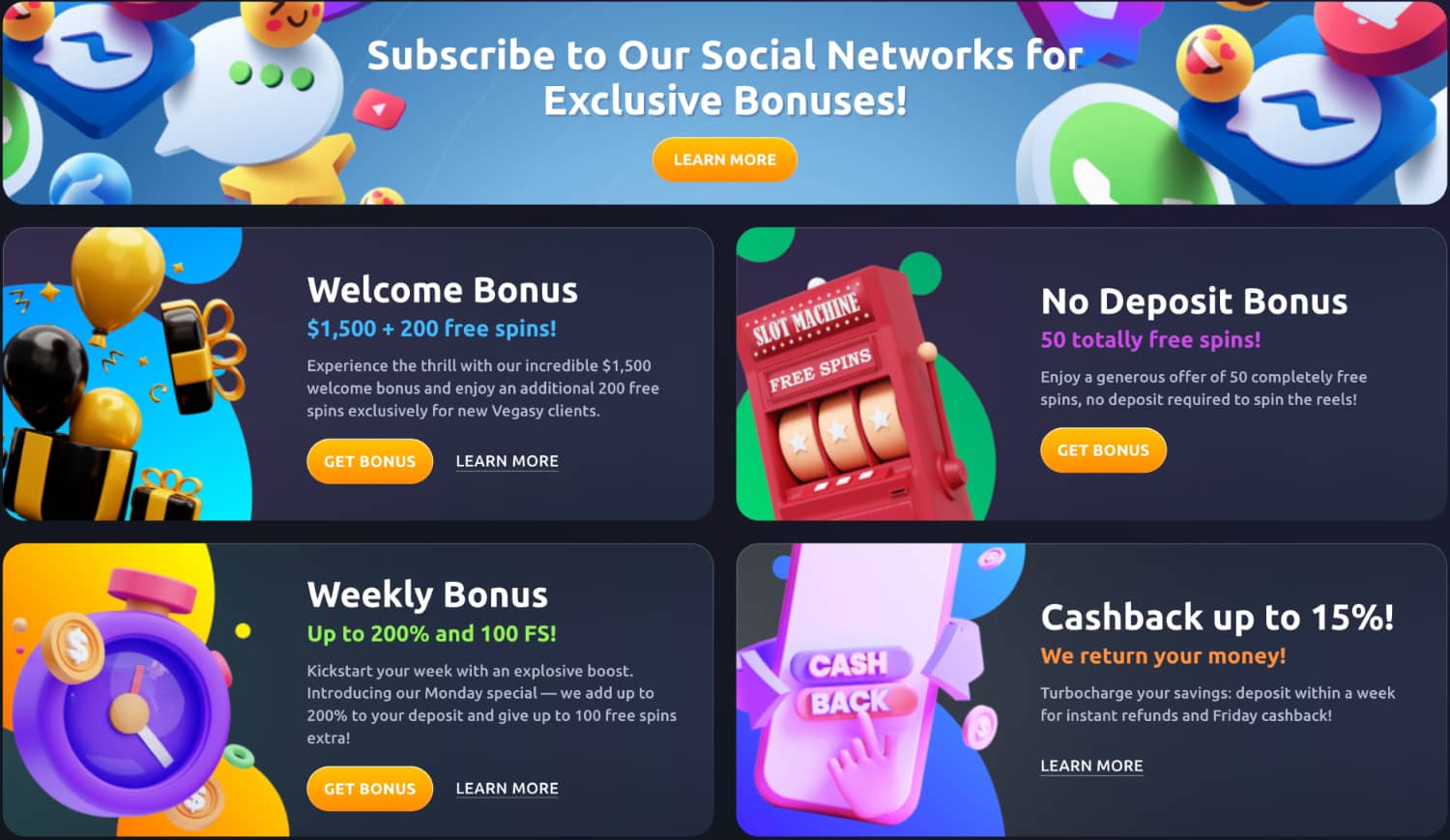 تلعب المكافآت دوراً حاسماً في تعزيز تجربة اللعب، ويقدم كازينو Vegasy مجموعة تنافسية من العروض الترويجية المصممة لمكافأة كل من اللاعبين الجدد والأوفياء. هيكل المكافآت متنوع، يغطي حزم الترحيب والعروض الأسبوعية المنتظمة وبرنامج VIP شامل يوفر فوائد متصاعدة.